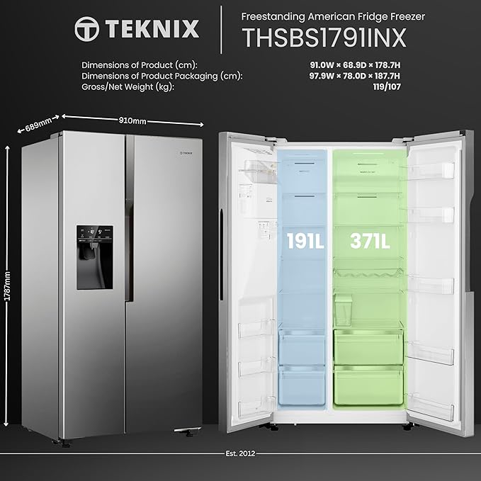 The Teknix THSBS1791PLUX is a sleek, plumbed 90cm American-style fridge freezer in modern Inox Silver. With a generous 562L total capacity, Total No Frost technology, and built-in ice and water dispensers, it offers both style and high performance for contemporary kitchens.